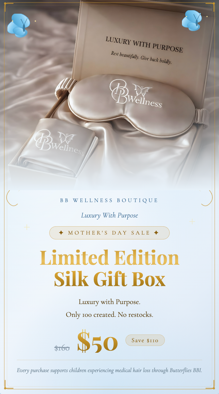 Every item we curate — from THE SILK BOX, silk-lined sleep caps and crystal-infused accessories to affirmational kits and cozy comfort wraps — is intentionally designed with healing in mind. Our materials are luxe, our packaging is thoughtful, and our mission is unwavering.